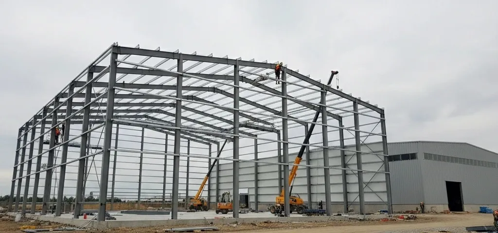 После завершения работ по фундаменту начинается монтаж металлоконструкций, который представляет собой взаимосвязанную систему колонн и ферм. Монтаж занимает достаточно короткий срок благодаря предсобираемым элементам.